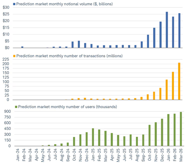 “Prediction markets have grown exponentially, as shown in the chart below. It's not just monthly volume growth, which has risen to more than $25 billion since 2024 according to Dune. It's also total transactions, which have skyrocketed from about 240,000 to more than 200 million, while monthly active users have grown from about 4,000 to almost 900,000 (Dune). At the same time, a March 2026 report from Citizens JMP Securities covering the period from July 2025 to mid-March 2026, showed that prediction market users experienced higher losses than users of other gambling products, with a median loss of 8% compared to a loss of 5% for sports bettors.”