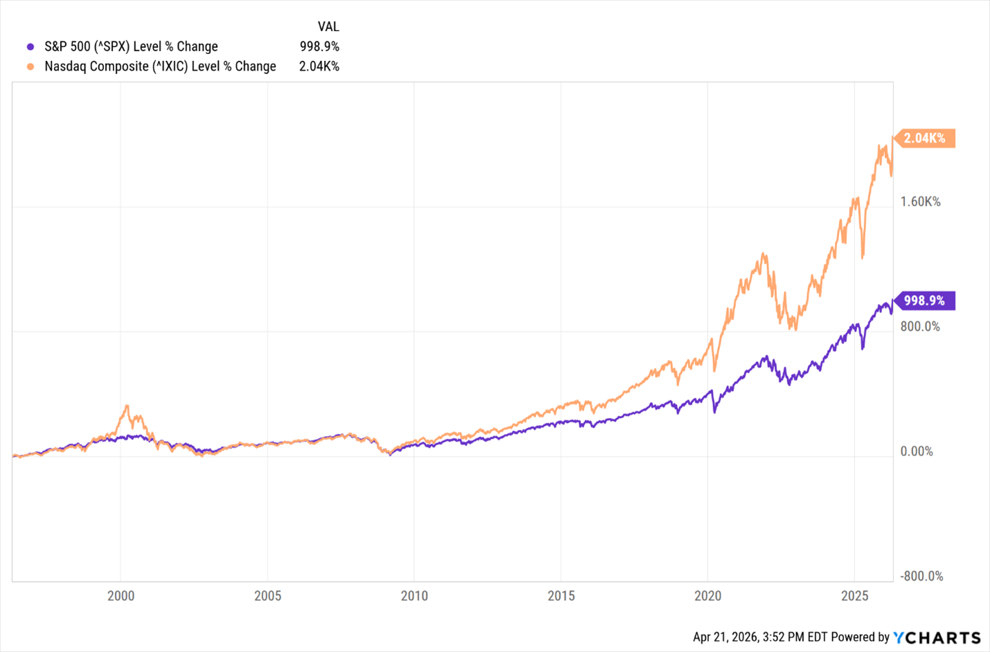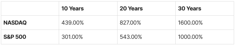 Below are a historical performance outlines and charts of cumulative total return (including dividends) of the S&P 500 and NASDAQ indices for the past 10, 20, and 30 years. Note that one cannot invest directly into an index.
