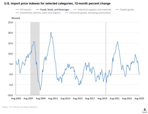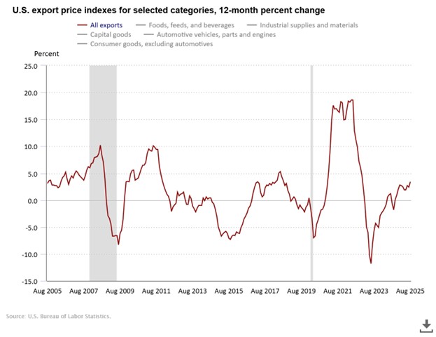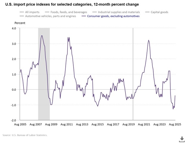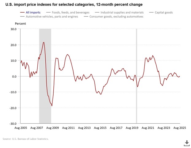 So far, import prices have not been meaningfully impacted by tariffs. As mentioned last week, costs from US producers to retail have been declining in 2025. Based on these reports last week and this week, it would be fair to say that prices are stabilizing in the US for the near future. Last Wednesday, the Federal Reserve, as widely expected, lowered its discount rate by 0.25%. The lower discount rate in a stable inflationary market should be good news for consumers and households. The residential and commercial real estate industry may see an improvement if mortgage rates also follow the discount rate down. Lower interest rates will be a bonus for US companies to lower their lending costs and provide additional capital for expansion.
