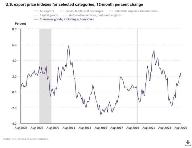 Annualized costs of consumer goods exports have been increasing in 2025 compared to declining costs of imports.